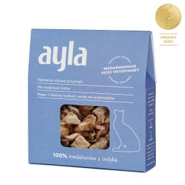 Marka AYLA Care to producent smacznych i zdrowych przysmaków liofilizowanych dla kotów. Ich produkty cieszą się coraz większym uznaniem wśród właścicieli zwierząt, a szeroki wybór ich artykułów znajdziesz w naszym sklepie. Smaczki AYLA Care charakteryzują się doskonałą jakością oraz dbałością o jak najlepszą formę czworonogów oferując im naturalne i zdrowe pożywienie. Dzięki zastosowaniu metody liofilizacji, przysmaki zachowują wszystkie wartości odżywcze mięsa — są pożywne i lekkostrawne. Zróżnicowana oferta  produktów AYLA Care obejmuje różnorodne rodzaje mięsa, takie jak pierś kurczaka, pierś z indyka, czy kaczki, co pozwala właścicielom na dostosowanie diety swojego pupila do jego indywidualnych potrzeb i smakowych wymagań. Co ważne, przysmaki te nie zawierają żadnych sztucznych dodatków, zbóż, czy konserwantów, dlatego są odpowiednie nawet dla kotów z wrażliwym układem pokarmowym.