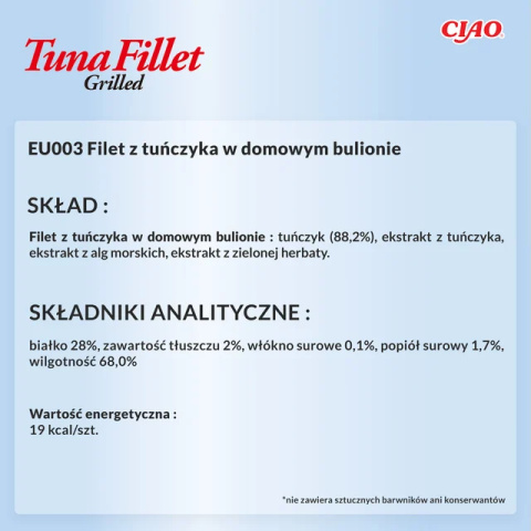 Smakołyk dla kota - Inaba Ciao to delikatnie grillowany filet z tuńczyka w domowym rosole, wykonany z ręcznie ciętych, starannie wyselekcjonowanych kawałków najlepszej jakości tuńczyka.