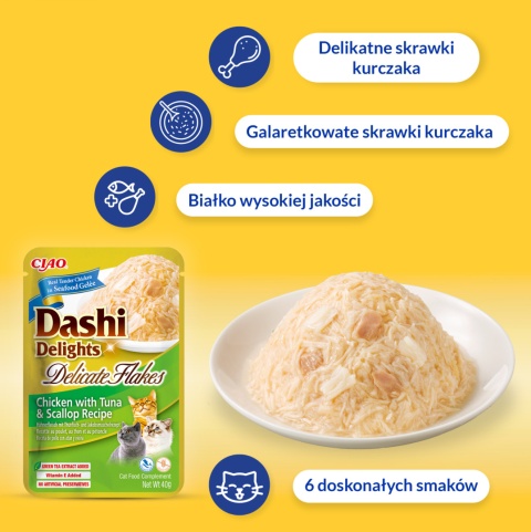 INABA Dashi Delights Flakes z kurczaka i łososia to tradycyjny japoński bulion rybny na bazie płatków z tuńczyka bonito, charakteryzujący się bogatym i wyrazistym smakiem.