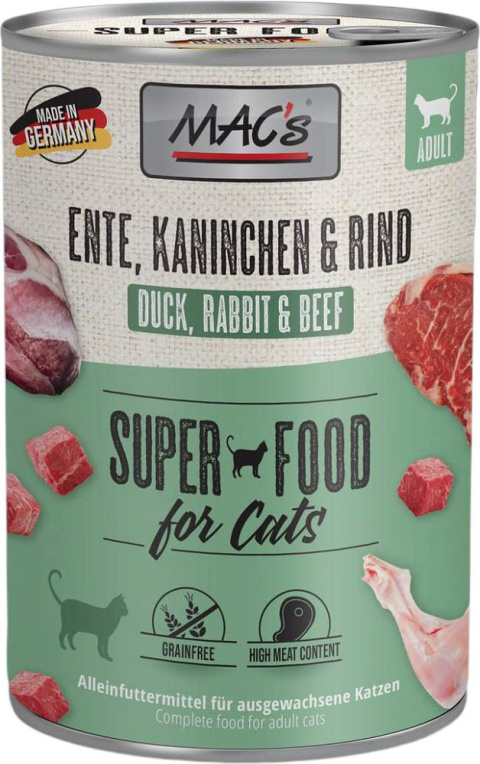 Mokra karma MACs cats superfood kaczka, królik i wołowina bez dodatku zbóż, charakteryzuje się wysoką zawartością mięsa najlepszej jakości - co najmniej 90%, co idealnie odpowiada naturalnym nawykom żywieniowym kotów.