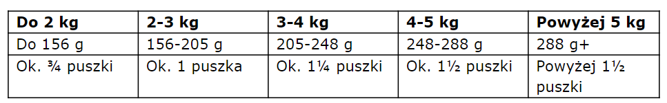 Podane wartości są orientacyjne. Wyznaczając dzienną porcję, należy wziąć pod uwagę rasę, wiek, temperament, poziom aktywności i kondycję kota.
